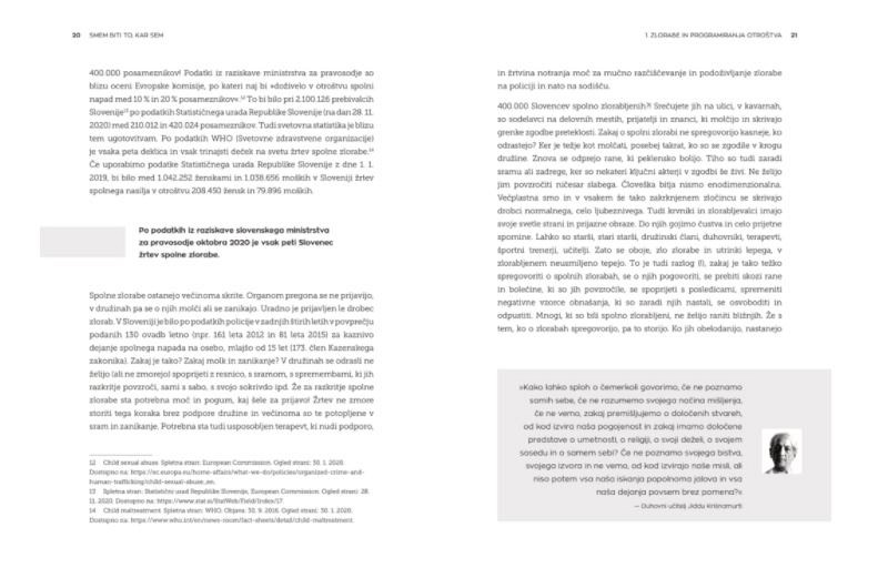 Rane otroštva nosimo s seboj. Po zadnji uradnih podatkih iz raziskave slovenskega ministrstva za pravosodje oktobra 2020 je vsak peti Slovenec žrtev spolne zlorabe. Vsak peti Slovenec! 400.000 ljudi. Njim dodajmo tiste iz družin, ki jih je zaznamovalo nasilje, alkoholizem in druge odvisnosti, hude telesne in duševne bolezni, disfunkcionalni medčloveški odnosi. Vsi ti ranjeni otroci imajo kot odrasli mnogotere težave. In verjetno ni človeka, ki ne bi bil kot otrok močno ranjen.
