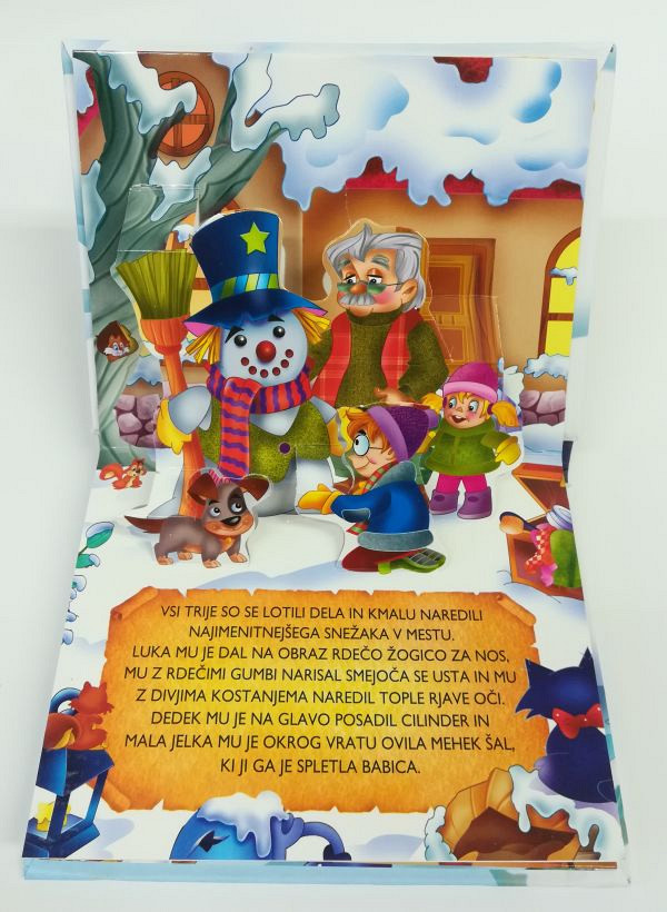 Knjiga postavljanka s 3D ilustracijami. Zbirka klasičnih mini pravljic, ki jo sestavljajo naslovi: Rdeča kapica, Bambi, Knjiga o džungli, Sneguljčica, Pepelka, Obuti maček, Trije prašički, Trnuljčica, Mala morska deklica, Božič v gozdu. Miklavžev večer, Sneženi mož.Vatirana vezava, 12,5 x 16,5 cm, 10 strani.