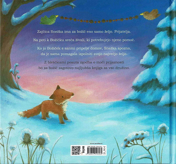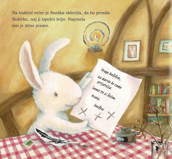 Zajčica Snežka ima za božič eno samo željo. Prijatelja. Na poti k Božičku sreča živali, ki potrebujejo njeno pomoč. Ko jo Božiček s sanmi pripelje domov, Snežka spozna, da je sama pomagala izpolniti svojo največjo željo. Preberite več