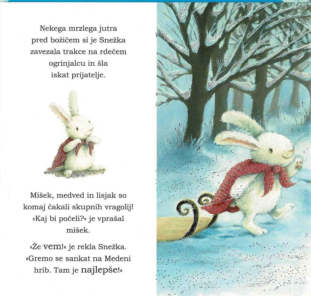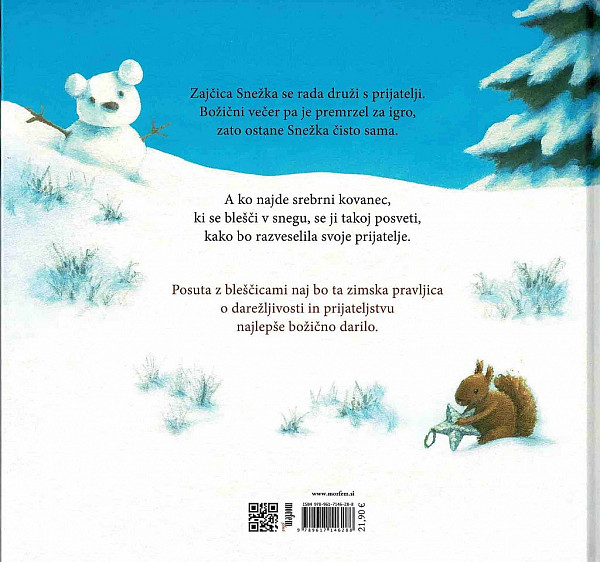 Zajčica Snežka se rada druži s prijatelji. Božični večer pa je premrzel za igro, zato ostane Snežka čisto sama. A ko najde srebrni kovanec, ki se blešči v snegu, se ji takoj posveti, kako bo razveselila svoje prijatelje. Preberite več