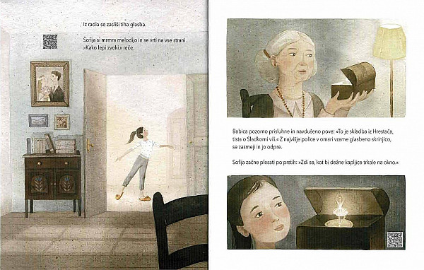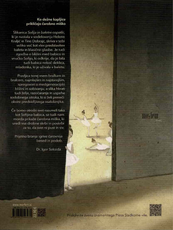 Čarobna skladnost likovne mojstrije in izbrane pripovedne lege nas ogovori s sirenskim zvokom, ki z odmerjenim občutkom za ritem vzhaja v slovesno zvenenje. Slikanica Sofija in baletni copatki se prikloni baletni umetnosti, glasbi in bližini. Pozorni bralec ne bo spregledal QR kode, ki v štirih prizorih prikliče čudovito tajinstven zven znamenitega Plesa Sladkorne vile.