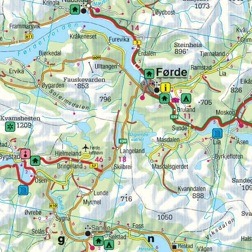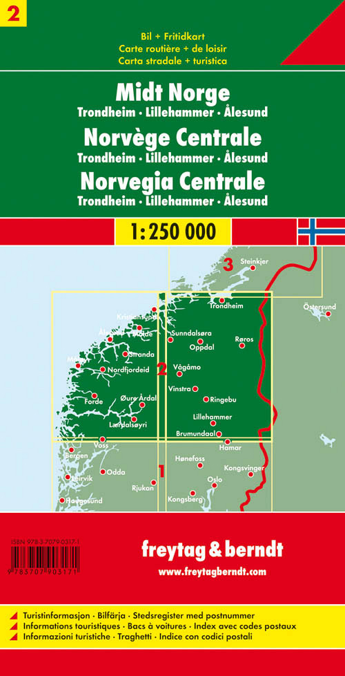a avtokarti Srednje Norveške merilu 1:250.000 je na voljo še veliko dodatnih informacij: turistične znamenitosti, nacionalni parki, kampi, trajekti in načrti ključnih mestnih središč (Trondheim-Lillehammer-Alesund). Poleg tega mestni register s poštnimi številkami omogoča hitro usmeritev. Preberite več