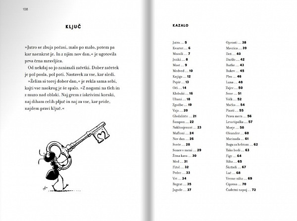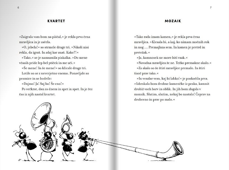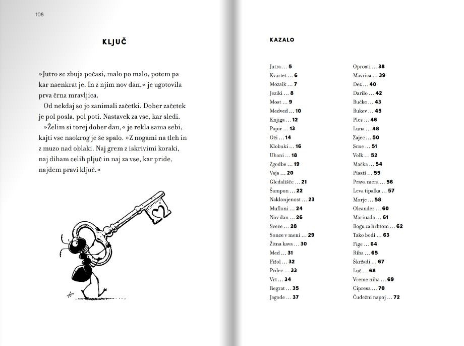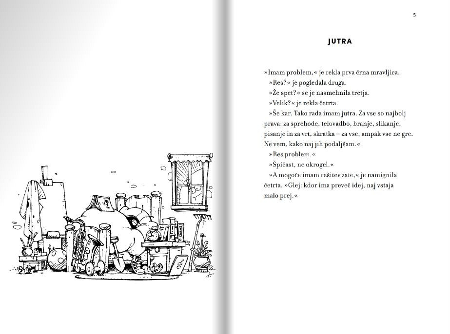 Anja Štefan že dolgo piše kratke zgodbe – pesmi v prozi – o štirih črnih mravljicah. O temnih in svetlih plateh življenja. V pričujoči knjigi je pripravila izbor 80 zgodb. Gre za izbrušene, poetične, bistroumne razmisleke o (so) bivanju v tem svetu. Polne so simbolov, tako da nagovarjajo mlade in odrasle, nekatere pa tudi najmlajše. Risbe Tomaža Lavriča nas popeljejo v humoren svet, kjer bi radi živeli vsi.