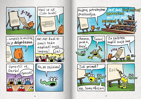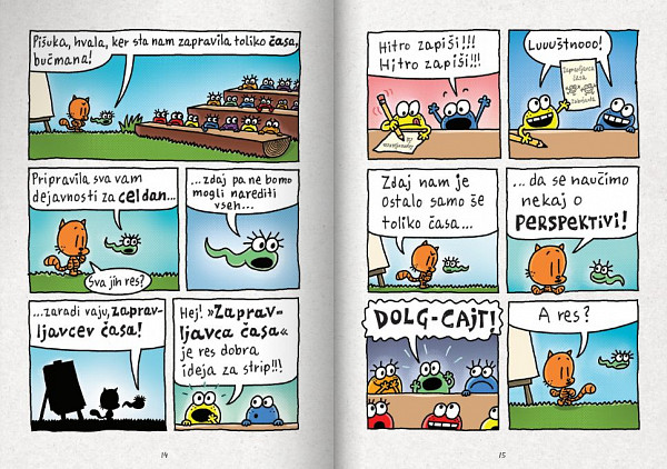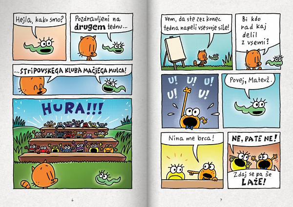 Tudi druga knjiga v seriji Stripovski klub mačjega mulca med otroki izjemno priljubljenega in nagrajenega Dava Pilkeya je vznemirljiva in polna vragolij, zvijač in smešnih obratov. Ilustracije so živahne in drzne, z navodili po korakih za risanje nekaj likov. Vsebuje tudi pomembna sporočila otrokom. Prav na straneh teh stripov je še več poudarka na sodelovanju kot v drugih Pilkeyjevih serijah. Žabice v tej knjigi nazadnje ugotovijo, kako sodelovati in ceniti stališče drugega – tako v učilnici kot zunaj nje.