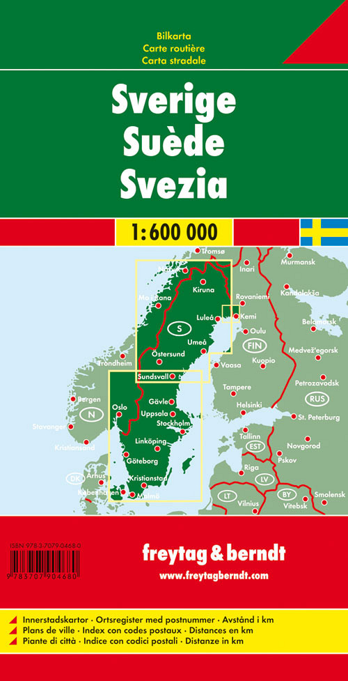 Na avtokarti Švedske v merilu 1:600.000 je na voljo še veliko dodatnih informacij: turistične znamenitosti, nacionalni parki, kampi, trajekti in načrti ključnih mestnih središč. Poleg tega mestni register s poštnimi številkami omogoča hitro usmeritev. Preberite več