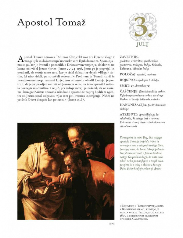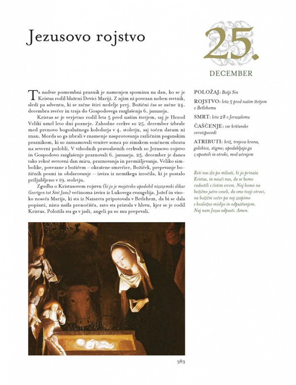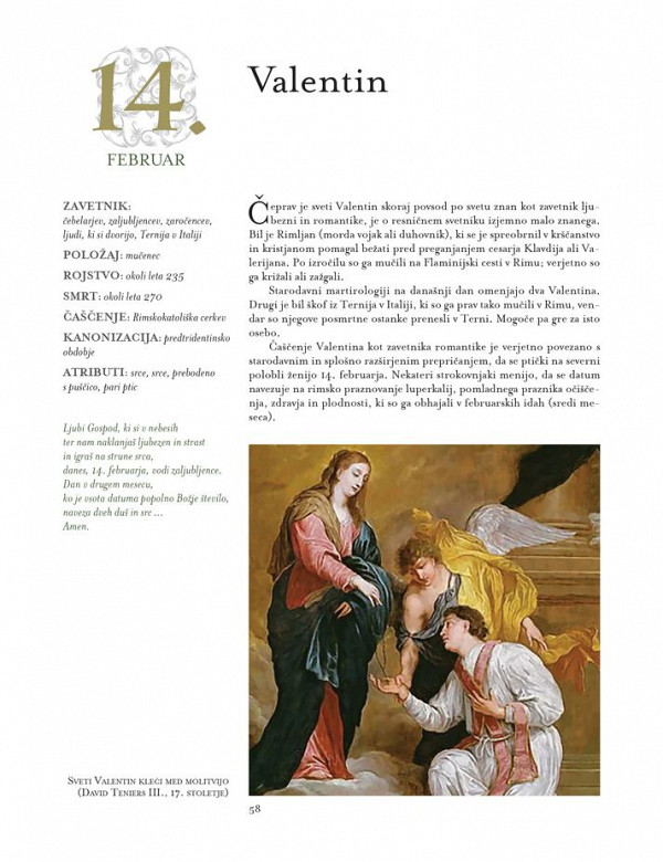 Knjigo krasijo čudovite ilustracije. Organizirana je po posebnih praznikih svetnikov in opisuje zgodovino, tradicijo in navdih iz življenj in naukov svetnikov v krščanskem kanonu, od svete Apolonije do svete Zite. V knjigi boste našli življenjske zgodbe, službo in beatifikacijo 365 svetnikov, od katerih je vsak čudovito upodobljen s klasičnimi slikami in zgodovinsko ikonografijo. V njej so navedena običajna zavetništva vsakega svetnika, tako da jih lahko bralci pokličejo z molitvami v času težav, bolezni ali izgube.