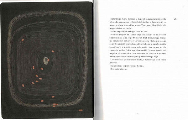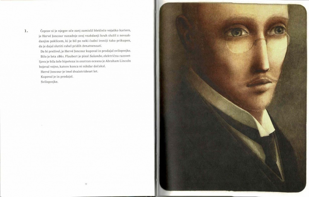 "Hervé Joncour je začutil, da mu telo obliva voda, najprej po nogah, nato vzdolž rok in po prsih. Voda kakor olje. In naokrog čudna tišina. Čutil je lahkost svilene tančice, ki je legla nanj. In dlani neke ženske – neke ženske – ki so ga otirale in gladile po koži, povsod: tiste dlani in tista tkanina, stkana iz samega niča. Sam se sploh ni premaknil, niti takrat ne, ko je začutil, da mu dlani drsijo z ramen proti vratu, prsti – svila in prsti – pa k ustnicam, ki so jih pobožali, enkrat samkrat, počasi, nato pa izginili."