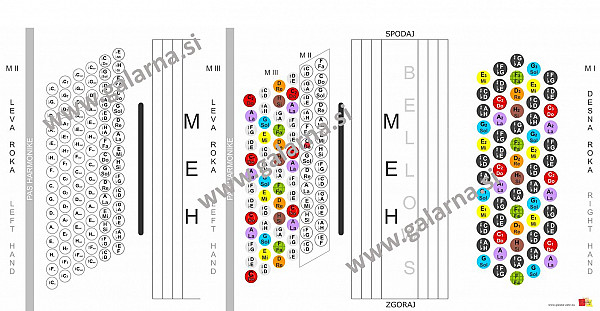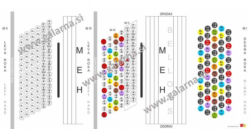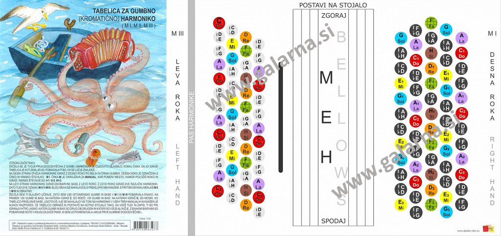 ZANIMIVOST: Z enakimi barvami so, samo ko se prvič pojavijo, pobarvane note v prvem učbeniku za začetnike na gumbni harmoniki z naslovom 'Prve gumbolovščine so več kot pustolovščine', ki je pravkar izšel (decembra 2022) in ga lahko naročite v naši spletni knjigarni. Zavod za šolstvo RS je potrdil, da učbenik Prve gumbolovščine so več kot pustolovščine v celoti ustreza standardom in normativom za poučevanje harmonike v 1.r. glasbene šole. To je prvi učbenik z originalno metodo in skladbami napisanimi za melodijski bas .