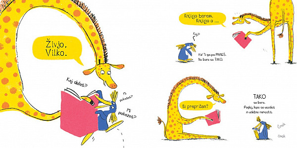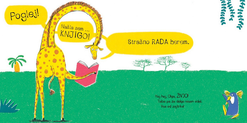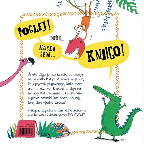 Poglej našla sem knjigo! Žirafa Olga je vsa iz sebe od veselja, ker je našla knjigo. A komaj se je loti, že ji prijatelji prigovarjajo, kako mora brati … leže kot krokodil … stoje na eni nogi kot plamenec … in celo vise z glavo navzdol kot opica! Preberite več
