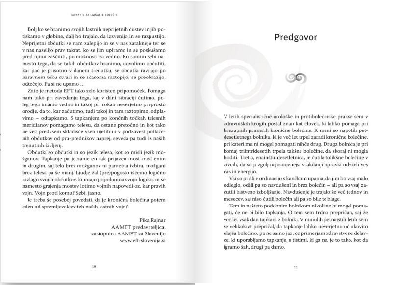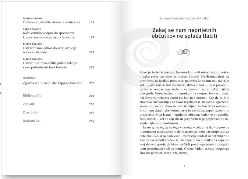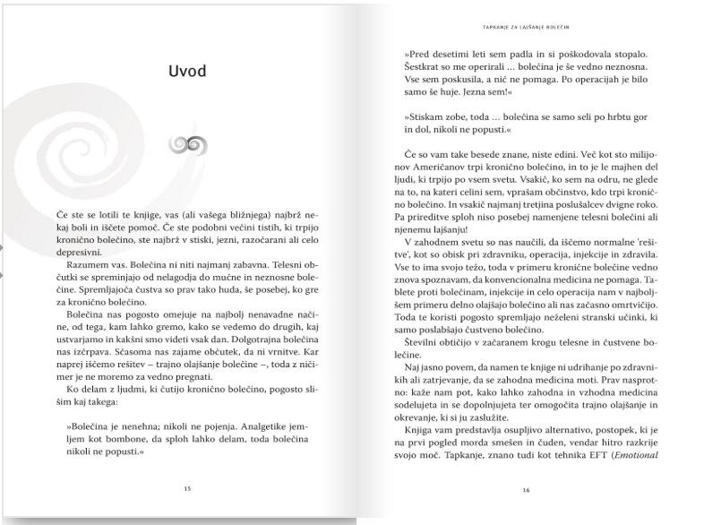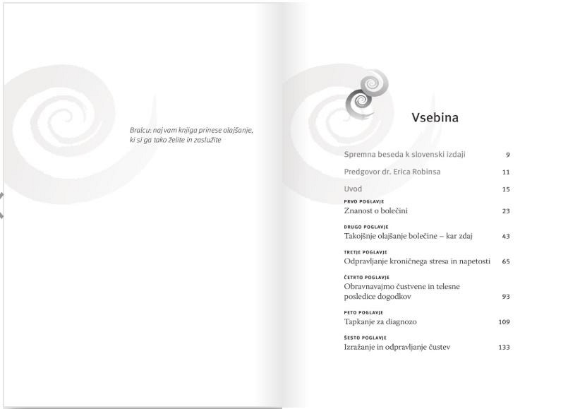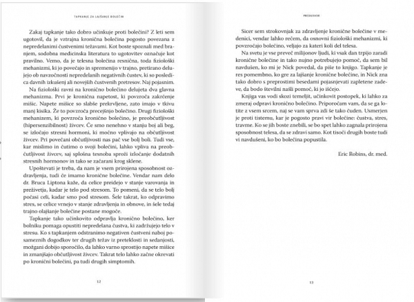 S preprostimi navodili za tapkanje in vajami vam Nick pomaga ozdraviti čustveno bolečino in prepričanja iz ozadja, zaradi katerih ljudje pogosto obtičijo. Prav tako spregovori o temah, za katere si morda ne bi mislili, da so povezane s kronično bolečino: postavljanje meja, obvladovanje strupenih odnosov, preseganje upiranja spremembam, spoznanje moči, ki jo ima diagnoza, predelovanje jeze. Možgani in telo lahko z veliko možnostmi ustvarjajo, povečujejo in podaljšujejo bolečino. Ko boste prebrali to knjigo, ne boste le vedeli, kaj vam povzroča bolečino, temveč tudi, kako se je v celoti in za vedno znebiti. Toda, priznajmo si: pri tem ne gre le za odpravo bolečin. Gre za vaše opolnomočenje, da vzamete svoje telo nazaj v svoje roke in zaživite življenje, kakršnega si želite.
