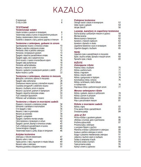 Testenine in rižote naravnost obožujemo, saj nam, ker so združljive s široko paleto sezonskih sestavin, omogočajo, da smo pri kuhanju ustvarjalni. V novi knjigi se odličnim tradicionalnim in sodobnim receptom za testenine in rižote tako pridružujejo tudi recepti za žita, ki v vsakdanji prehrani zaradi svojih prehranskih vrednosti postajajo vedno bolj cenjena. Pripravili smo testeninske solate, testenine in rižote z zelenjavo, gobami in sirom in morskimi sadeži, azijske testenine, polnjene testenine, lazanje, kanelone in zapečene testenine, njoke in jedi iz žit, zato bo pestrost jedilnika z novo knjigo s 96 stranmi zagotovljena!Trda vezava, 22,5 x 29,5 cm, 96 strani.