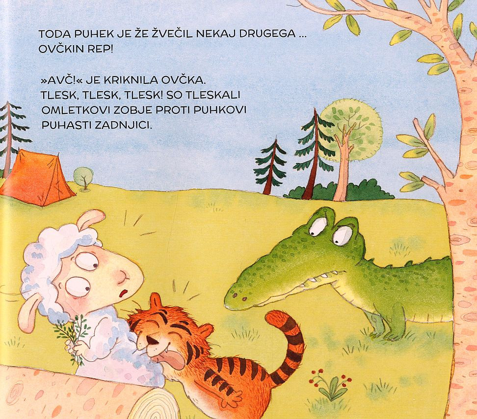 Volk, Ovčka in Omletek so našli trigrovega mladička. Ljubkega, puhastega tigrovega mladička. »Ga lahko obdržimo?« prosim Ovčka. »Le objem si želi« Toda tigrov mladiček ima strašen načrt!VELIKE TISKANE ČRKE.Trda vezava, 27 x 23,5 cm, 24 strani.