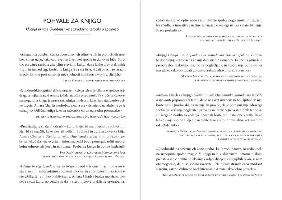 »Knjiga Amare Charles Učenja in vaje Quodoushke: starodavna izročila o spolnosti zajema bistvo intime. Iz osebne izkušnje lahko nedvoumno povem, da je Amara genialna ženska, ki prekipeva od znanja in življenjske energije. Njena knjiga vas bo naučila, kako postati bolj čuteč ljubimec, osvoboditi zastalo energijo in se radostiti v telesu, da bi tako uskladili svoj človeški, živalski in duhovni vidik. Njena razlaga različnih tipov spolne anatomije je pravo razodetje. Učenja in vaje Quodoushke lahko pripeljejo do kvantnega preskoka v vašem pristopu k spolnosti in intimnosti.« - Steven Barnes, pisec in predavatelj, ki vadi borilne veščine