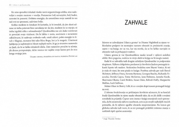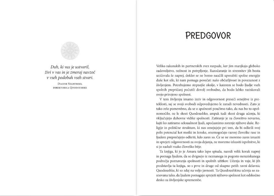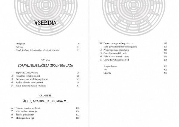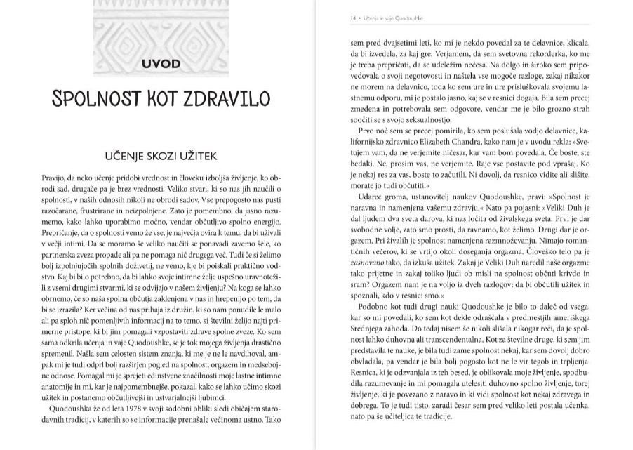 Te prakse, ki uporabljajo zdravilno moč spolne združitve in orgazma, nam pomagajo oživiti monotona razmerja, zaceliti čustvene rane in negotovosti v zvezi spolnostjo ter odkriti čudovito zdravilo, ki ga ta ponuja. Posvečena učiteljica Quodoushke Amara Charles prvič razkriva te nekoč skrivne nauke. Opisuje fizične, energijske in spolne značilnosti vseh devetih tipov moške in ženske spolne anatomije, pojasnjuje, kako jih prepoznati in kar najbolje zadovoljiti, ter nas spodbuja, da postanemo ponosni na svojo edinstveno anatomijo. Opiše tudi devet različic izražanja orgazma ter vaje za večji in intenzivnejši spolni užitek.