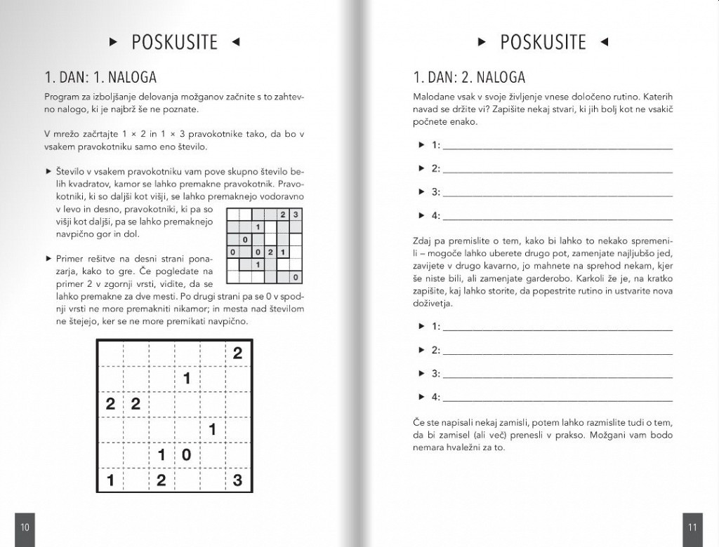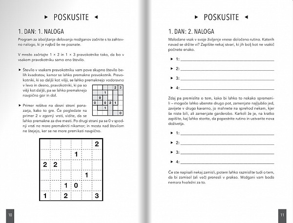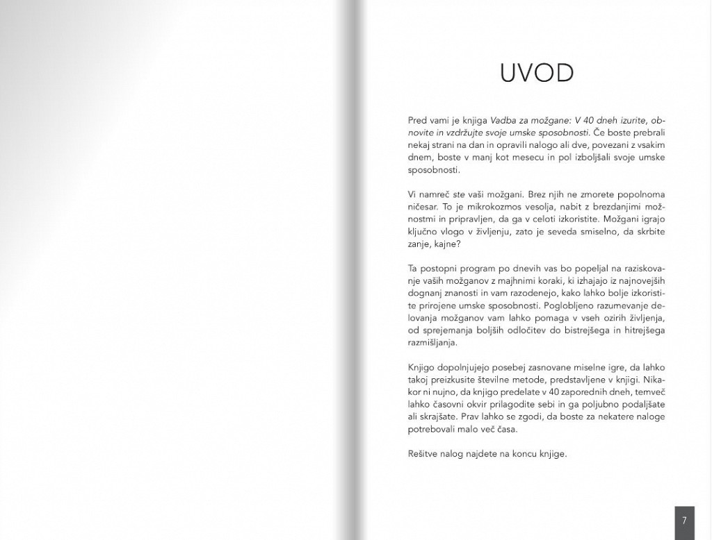»Za urjenje možganov je dobra vsaka dejavnost, ki vas miselno spodbudi in možganom pomaga ustvariti nove povezave, ki razširijo vaše umske sposobnosti. Pri tem gre za predstavo ’uporabljaj’ ali ’izgubi’ - to pa pomeni, da boste izgubili obstoječe umske sposobnosti, če možganov ne boste nenehno naprezali,« trdi avtor in dodaja, da nam lahko prav vaje, ki so usmerjene v določene veščine, pomagajo ohraniti in celo izboljšati sposobnosti tudi na drugih področjih.« - www.govori.se