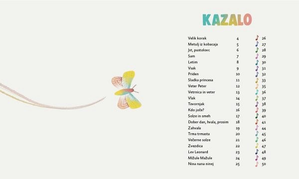 Pesmi so različnih vsebin, v katerih se vsak otrok lahko prepozna. Melodije so enostavne in nalezljive. Pozor! Ko se jih enkrat naučiš, ti ne gredo več iz glave. Pesmi so uporabne tako doma, v vrtcu, šoli. Primerne so tudi za otroške pevske zbore.