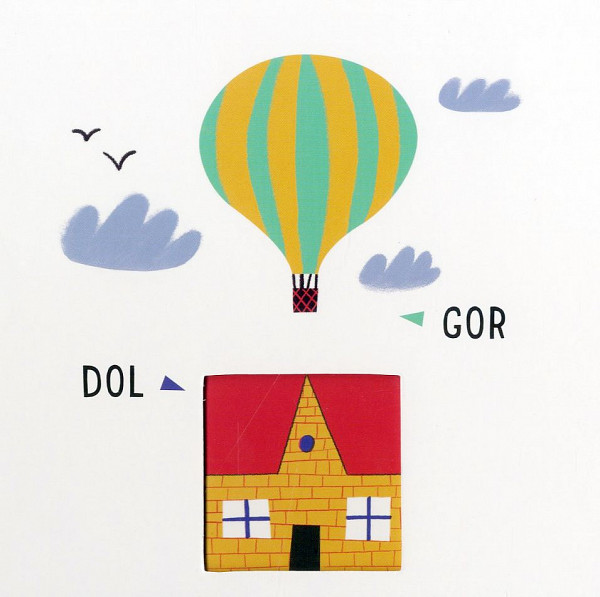 Kartonka, ki malčke uči prvih besed, predstavlja koncept nasprotij. Izbrana so osnovna nasprotja, ki jih malčki poznajo iz lastnega doživljajskega sveta, na primer veliko – majhno, dol – gor, visoko – nizko… Med osnovna nasprotja pa so primešana tudi malčkom teže doumljiva nasprotja, kot so staro – novo, dan – noč, daleč – blizu. Mešan izbor omogoča staršem, da se prilagodijo malčkovi razvojni stopnji in zmožnosti razumevanja težavnejših konceptov.
