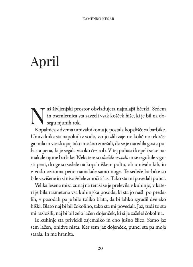 Kamenko Kesar je priljubljen slovenski pisatelj, znan po svojem edinstvenem humorju in spodobnosti opazovanja vsakdanjih situacij z očimi običajnega človeka. Njegovi iskreni zapisi, prepleteni z duhovitostjo in toplino, navdušujejo bralce, ki se zlahka poistovetijo z njegovimi zgodbami o družini, prijateljstvu in človeških odnosih. Doslej je izdal štiri prodajne uspešnice, ki so stalnica v slovenskih domovih in prinašajo smeh ter premislek v vsakdan.
