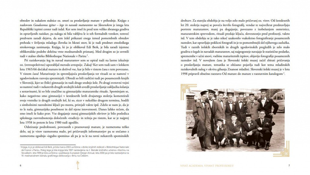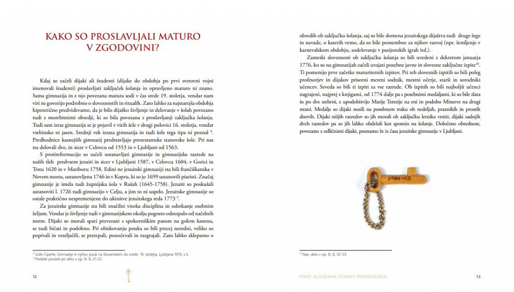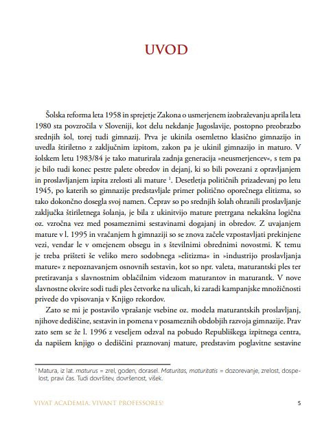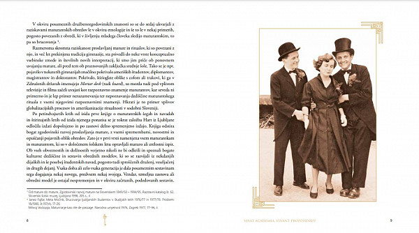 Knjiga odstira bogat zgodovinski razvoj proslavljanja mature, z vsemi spremembami, novostmi in opuščanji pojavnih oblik obredov. Zato je v prvi vrsti namenjena vsem maturantkam in maturantom, ki so ali še bodo opravljali maturo ali zrelostni izpit. Pričujoča knjiga naj bi spodbudila tudi večjo skrb za zbiranje in ohranjanje dediščine maturantskih proslavljanj in obredov. Preberite več