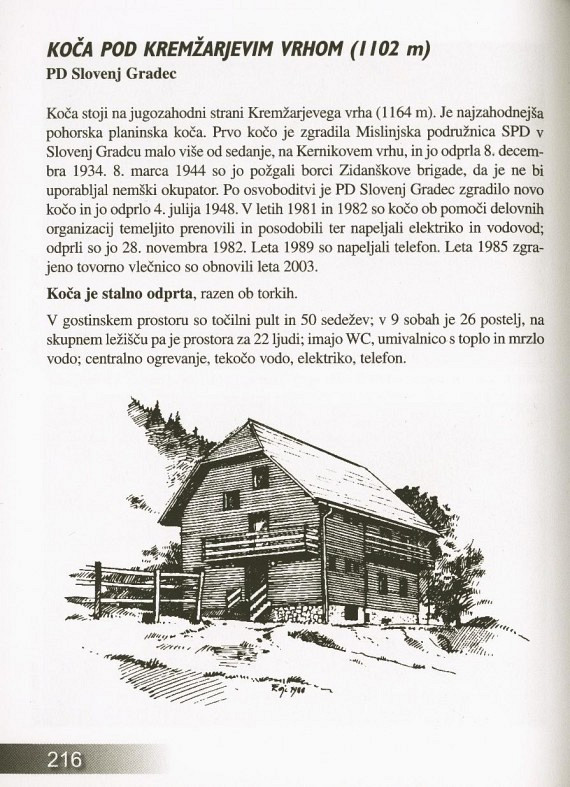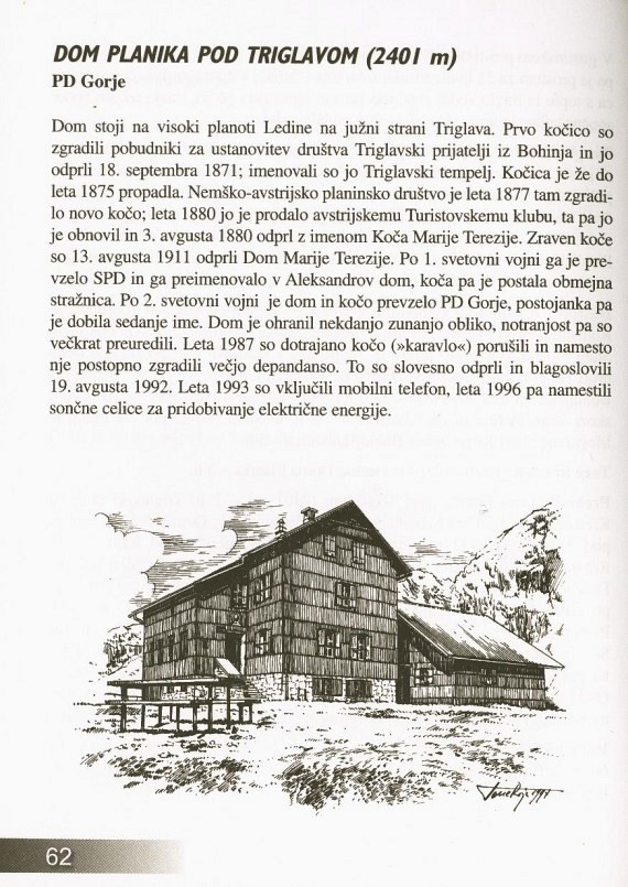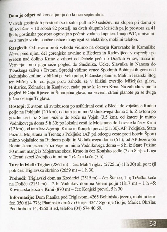 Dopolnjen in popravljen ponatis četrte izdaje avtorja Jožeta Dobnika priča o tem, da so planinske koče po Sloveniji še vedno dobro obiskane in da številni Slovenci z veseljem planinarijo. V vodniku je na kratko opisanih več kot 160 planinskih domov, koč, bivakov, postojank in zavetišč, zgodovina vsake izmed koč s podatki o njenem obratovalnem času, podan je opis zmogljivosti in opremljenosti koč, vodnik pa vključuje tudi podrobna pojasnila o dostopih in poteh do koč. Ilustracije sta prispevala A. Rojc in J. Lasnibat.