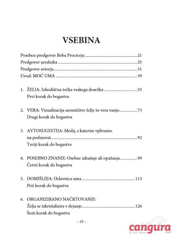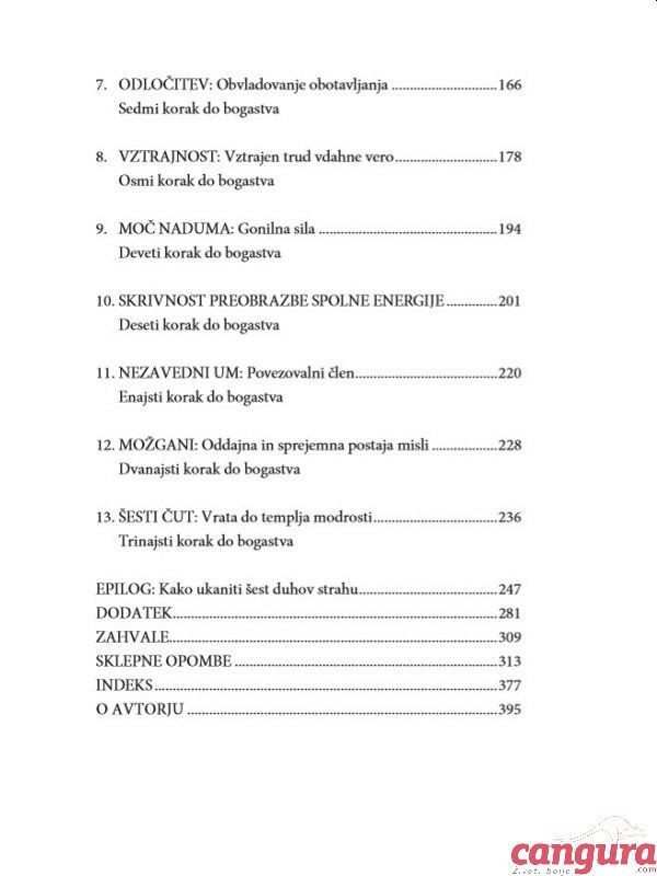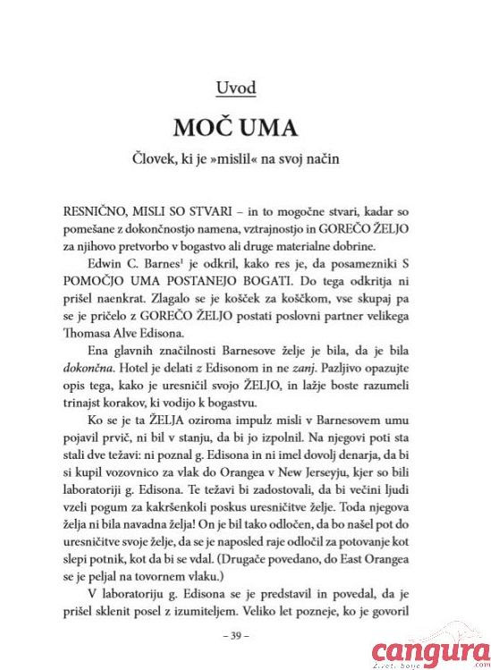 "VSA POGLAVJA te knjige govorijo o skrivnosti služenja denarja. Ta skrivnost je prinesla bogastvo več kot petstotim izjemno bogatim ljudem, ki sem jih skrbno analiziral v večletnem obdobju. Na to skrivnost me je opozoril Andrew Carnegie pred več kot četrt stoletja. Premeteni, ljubki stari Škot jo je brezskrbno vrgel v moj um, ko sem bil še fant. Potem se je ponovno usedel na svoj stol z veselo iskrico v očeh in previdno gledal, če imam dovolj pameti, da bi razumel poln pomen tistega, kar mi je rekel.