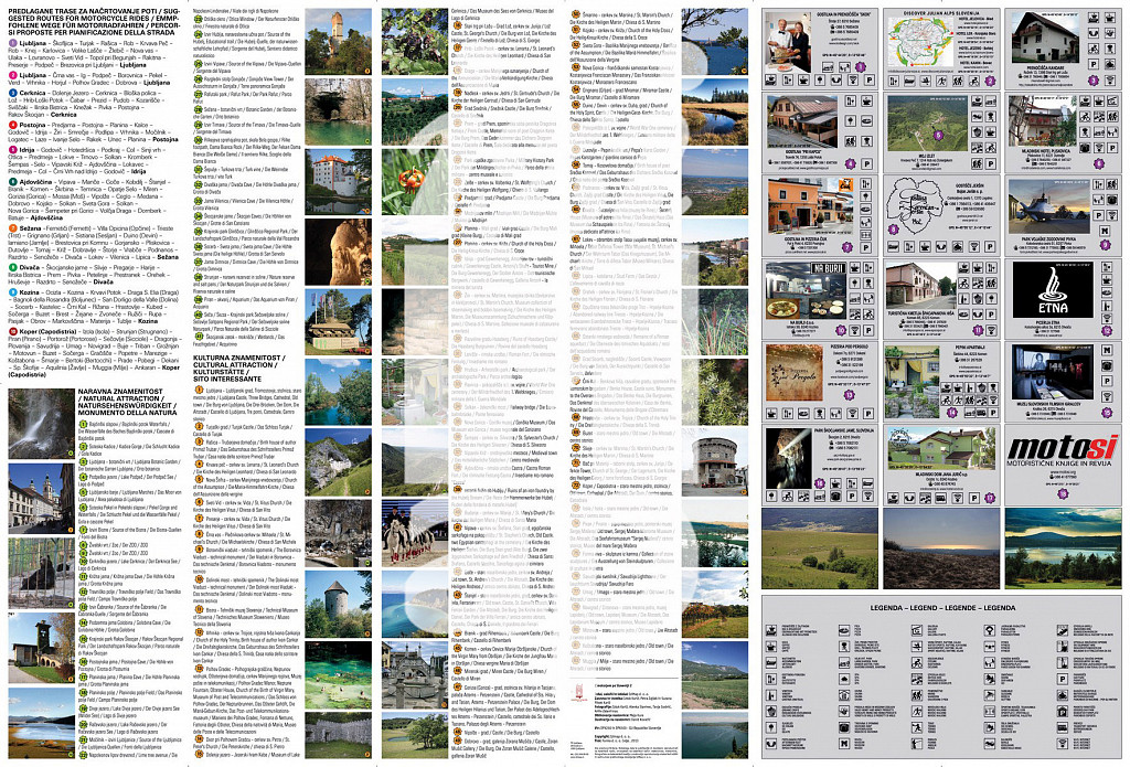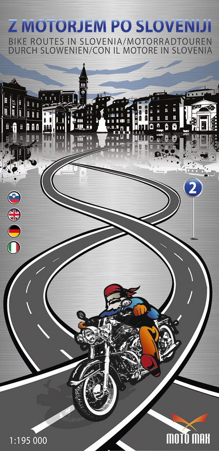 Motoristična karta za območje jugozahodne Slovenije. Vsebina: - predlagane trase za načrtovanje poti,- naravne znamenitosti,- kulturne znamenitost,- nekaj idej za prenočišča.Vsaka vsebinska kategorija je označena s številkami in predstavljena v legendi.- merilo: 1: 195 000 - dimenzije zložene karte: 11,3 x 23 cm - mehka karta brez trdih platnic v pvc ovitku