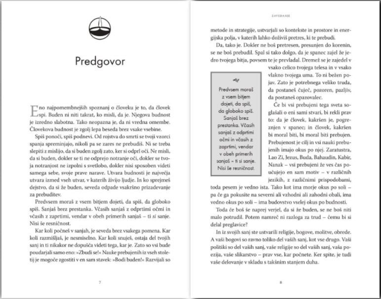 Veliki učitelji, denimo Lao Zi ali Buda, pravijo, da večina ljudi stopa skozi življenje, kakor da bi hodili v spanju. Nikoli niso zares navzoči pri svojem početju, nikoli povsem dovzetni za okolico. Ne vedo niti, kaj jih žene pri delovanju in govorjenju. Pa vendar smo v posebnih okoliščinah že vsi izkusili trenutke zavedanja – ali prebujenja, če hočete. Ko se na cesti nenadoma zgodi nesreča, se čas navidezno ustavi in nenadoma se zavedamo vsakega premika, vsakega zvoka, vsake misli. To se zgodi tudi v trenutkih, ki se nas globoko dotaknejo – na primer, ko smo prvič priča prihodu otročička na svet ali ko smo z nekom v trenutku njegove smrti.