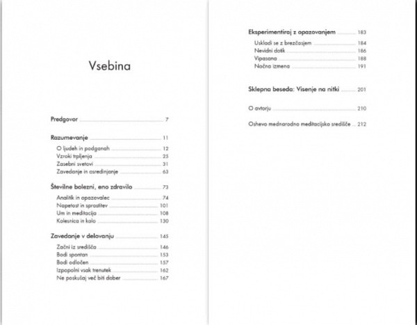 Osho pravi, da je zavedanje ključ do usmerjenosti v našo notranjost, ključ do naše osrediščenosti in osvobojenosti v vseh vidikih življenja. V tej knjigi nas Osho nauči živeti bolj pozorno, bolj čuječe in meditativno – z ljubeznijo, ljubečo skrbnostjo in zavedanjem.