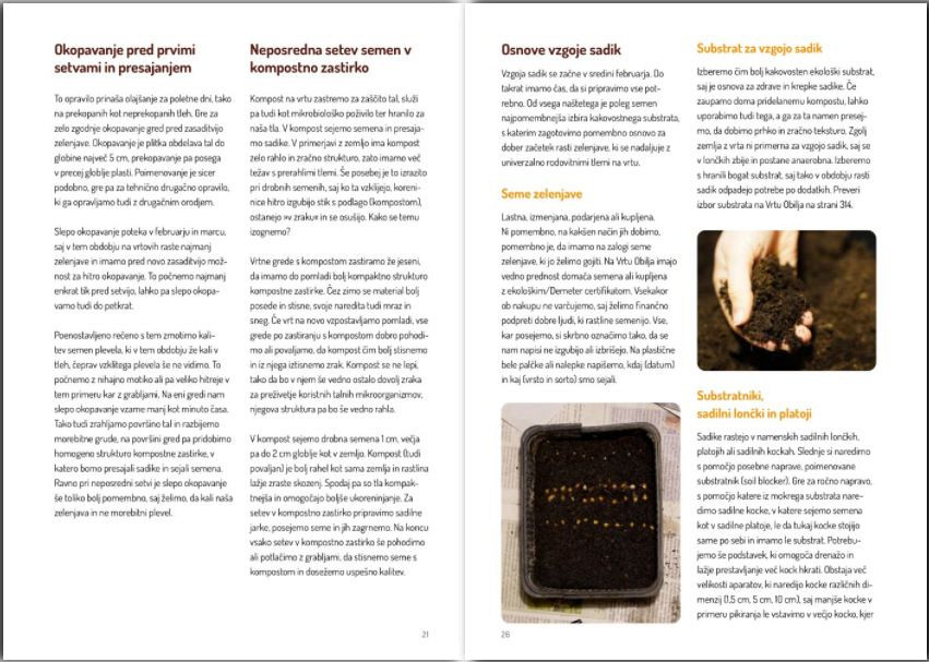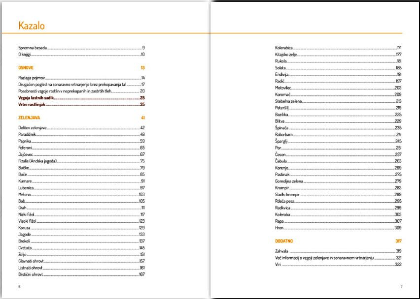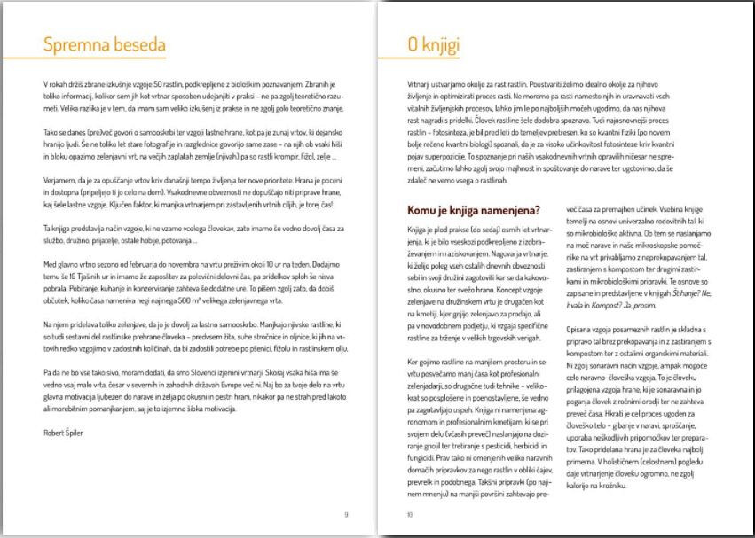 Knjiga je namenjena novi generaciji vrtnarjev, ki zaupajo naravnim principom in si upajo vzgajati lastno hrano drugače – predvsem lažje in sistematično. Tehnično opisani postopki vzgoje 50 različnih vrst zelenjave vodijo vrtnarja do uspeha. V knjigi so zbrane zgolj avtorske fotografije in praktične izkušnje z Vrta Obilja. Vzgoja rastlin je skladna s pripravo tal brez prekopavanja in z zastiranjem s kompostom ter z ostalimi organskimi materiali.
