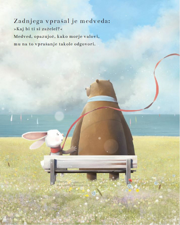 Vsako leto enkrat želje poletijo v nebo, da nam upanje in svetlobo prinesó ... Zajec, ki še nikoli nobene ni ujel, tisti hip ni vedel, kaj naj bi si zaželel. Z nasmehom do svojih treh prijateljev je odskakljal, da preveril bi, katero željo vsak od njih bi v nebo poslal. Preberite več