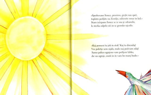 Sredi mračne zime naletava sneg, živali so prezeble, lačne in utrujene. Pogumna, barvita vrana se poda na tvegano pot do samega Sonca, da bi izprosila vsaj malo toplote in rešila živali najhujšega. Ji bo uspelo? Bo Sonce uslišalo njeno prošnjo? Se bo vrnila zdrava in nepoškodovana? Preberite več