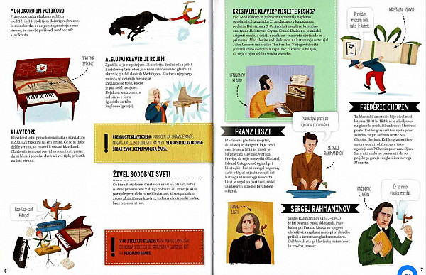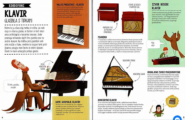Prebirali boste poglavja o klavirju, simfoničnem orkestru, polifonih glasbilih, godalih, big bandu, tolkalih, trobilih, vojaški godbi, trobentah in njenih sorodnikih, dixielandu, piščalih in pihalih, rock zasedbah, kitari in lutnji, piphatu, ljudskih glasbilih in elektronski glasbi.