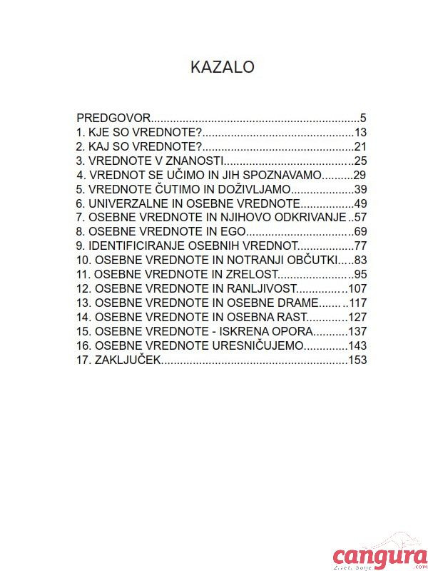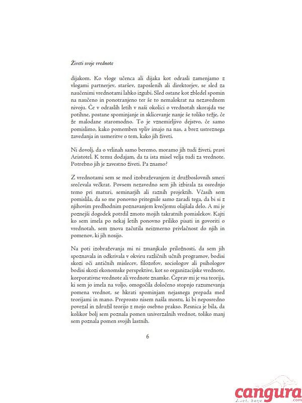 Knjiga Živeti svoje vrednote prinaša številne odgovore o osebnih vrednotah, zlasti tistih, ki se neposredno dotikajo srca in naših pristnih občutkov. Knjiga nam navdihujoče približa zavedanje o pomembnosti krepitve notranjega bogastva, ki ga gradimo z dejanji, skladnimi s srcem in lastnimi vrednotami. To je bogastvo, ki ni primerljivo s prepogosto opevanim materialnim bogastvom, temveč tisto, zaradi katerega postanemo bolje opremljeni za osebno jadranje v stalno spreminjajočemu se svetu.