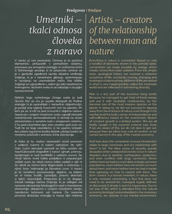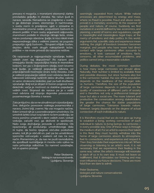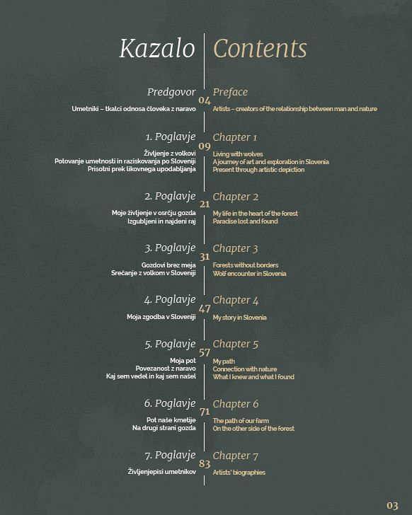Nastala je osupljiva zbirka likovnih del, ki preko umetnosti nekoliko drugače kot pisana beseda podajajo sporočila ter pozitivne vidike sobivanja. Naj vas umetniška dela ponesejo prek zgodb ljudi, ki so z volkovi našli skupno pot za sobivanje, in vas navdihnejo, da boste svet videli v drugačni luči.