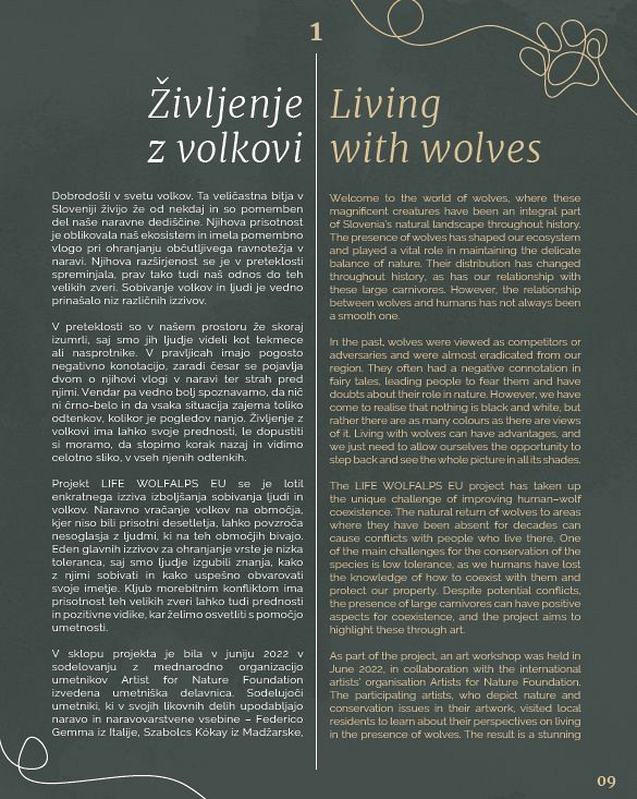 However, we have come to realise that nothing is black and white, but rather there are as many colours as there are views of it. Living with wolves can have advantages, and we just need to allow ourselves the opportunity to step back and see the whole picture in all its shades. As part of the LIFE WOLFALPS EU project, an art workshop was held in June 2022 in collaboration with the international artists’ organisation Artist for Nature Foundation, where participating artists from abroad and Slovenia visited local residents and learned about their perspective on life in the presence of wolves.