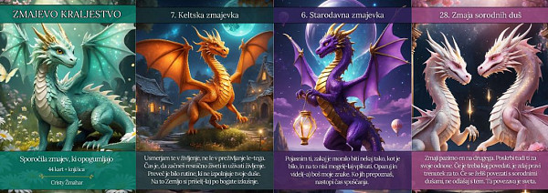 - Vsaka karta je portal v čarobni svet zmajev, kjer se prepletajo njihova modrost, odločnost in moč. Mistične ilustracije in močna sporočila vas bodo navdihnila, da odprete vrata v večjo jasnost, samozavest in uresničitev svojih ciljev.