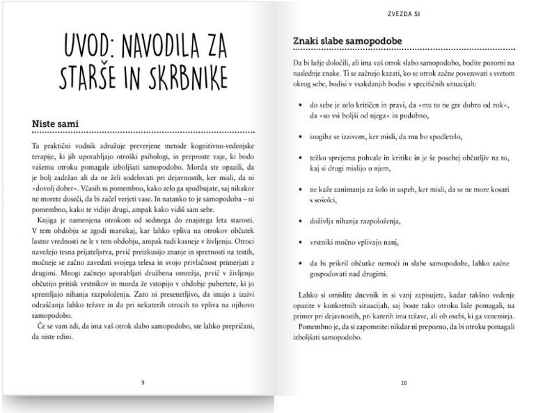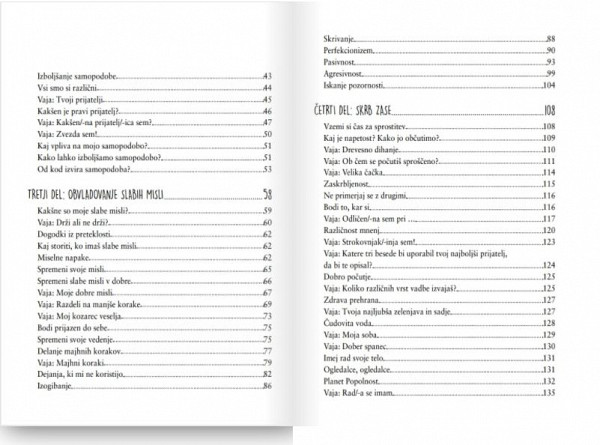 Ta knjižna uspešnica je preprost in zabaven delovni zvezek za otroke, ki ga lahko izpolnjujejo sami ali skupaj s starši ali skrbniki. Združuje dokazano učinkovite metode kognitivno-vedenjske terapije, ki jih uporabljajo otroški psihologi v šolah, in preproste vaje, s katerimi se bo vaš otrok naučil izboljšati svojo samopodobo.